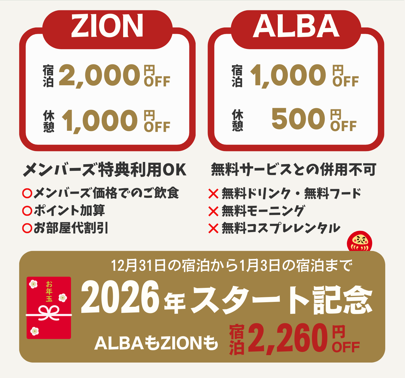 12/31~1/3は宿泊割引のみ(休憩は割引なし)となります